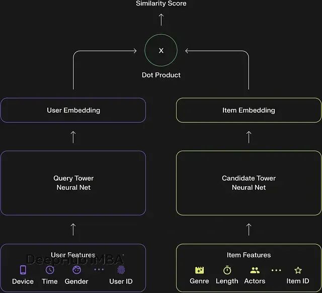 这种设计的巧妙之处在于将复杂的用户-内容匹配问题,转化为两个向量空间的相似度计算。