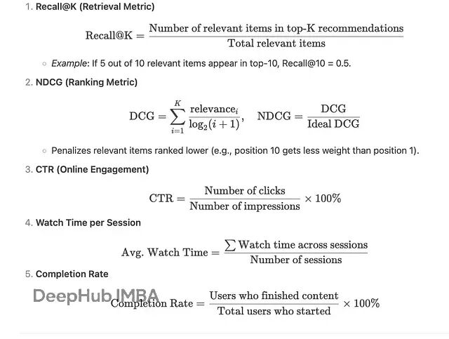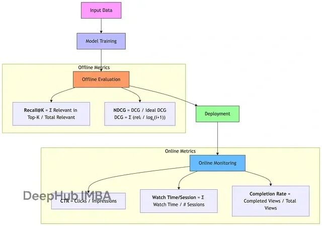 离线指标则用于模型开发阶段的快速评估:召回率@K 衡量候选召回的质量,NDCG 评估排序效果,AUC 反映分类性能等。