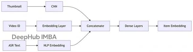 以视频为例视频特征相对更加多元化:基础 ID 信息(视频 ID、创作者 ID),内容标签和话题分类,音频特征(BGM、音效等),文本信息(标题、字幕、ASR 转录文本),视觉特征(通常使用预训练的 CNN 模型提取关键帧或缩略图的特征向量)。