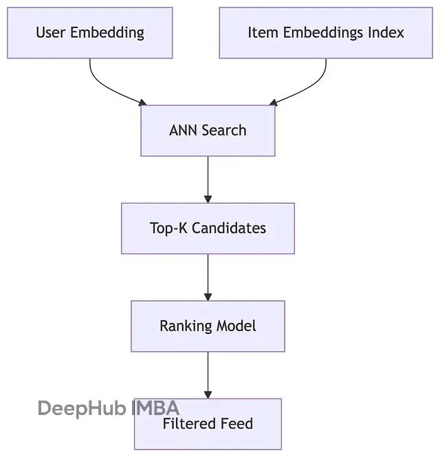 首先实时计算或获取用户的最新特征向量。接着通过 ANN 检索从全量视频库中召回几千个潜在候选。然后使用更复杂的排序模型对候选视频进行精排,考虑预期观看时长、互动概率等多个目标。