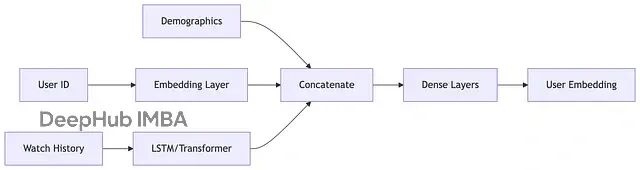 用户塔将观看历史、互动行为、时间上下文等信息压缩为 256 维向量,例如 [0.2, -0.7, ..., 0.4]。