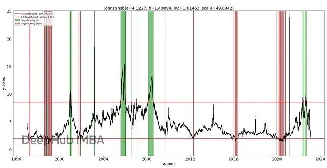 图9. 拟合分布并预测后的离群值可视化。绿条是95% CII上限外的离群值,红条是下限外的离群值