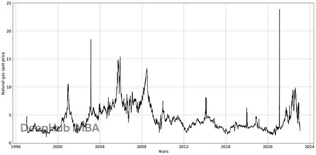 dfit.lineplot(df, xlabel='Years', ylabel='Natural gas spot price', grid=True)