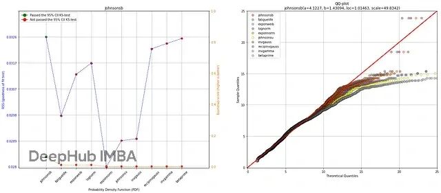 plt.show()摘要图显示拟合优度检验在所有top分布上得分不错(低分)。但看bootstrap结果,除了一个分布,其他全都过拟合了(图8A橙线)。这不意外,因为前面就注意到了过拟合和欠拟合。QQ图证实拟合分布与经验数据偏差较大(图8B)。只有Johnsonsb分布勉强合格。