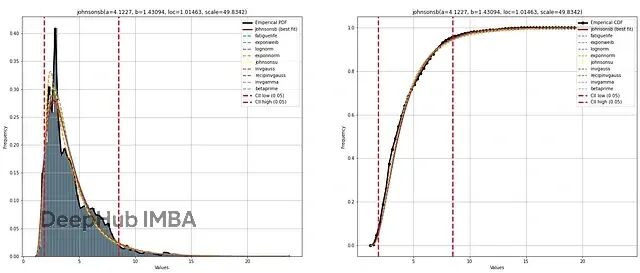 用distfit深入分析数据分布,确定配套的PDF。搜索空间设为所有可用PDF,bootstrap设为100评估过拟合。