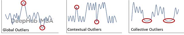 图1. 从左到右:全局离群值、上下文离群值、集体离群值示例