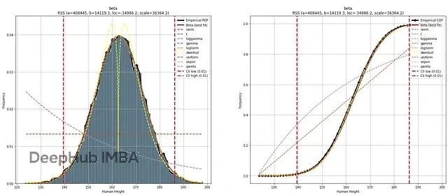 检测异常前先要对"正常身高"拟合一个分布(PDF)。distfit库可以拟合多达89个理论分布,这里只搜索常见的概率密度函数,因为身高数据大概率是钟形曲线。安装依赖