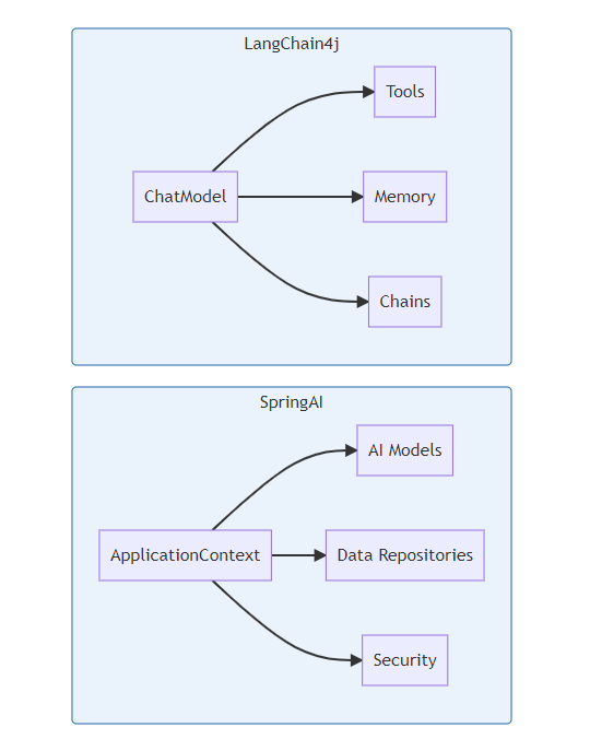 测试场景 | QPS (SpringAI) | QPS (LangChain4j) | 内存占用差异 |