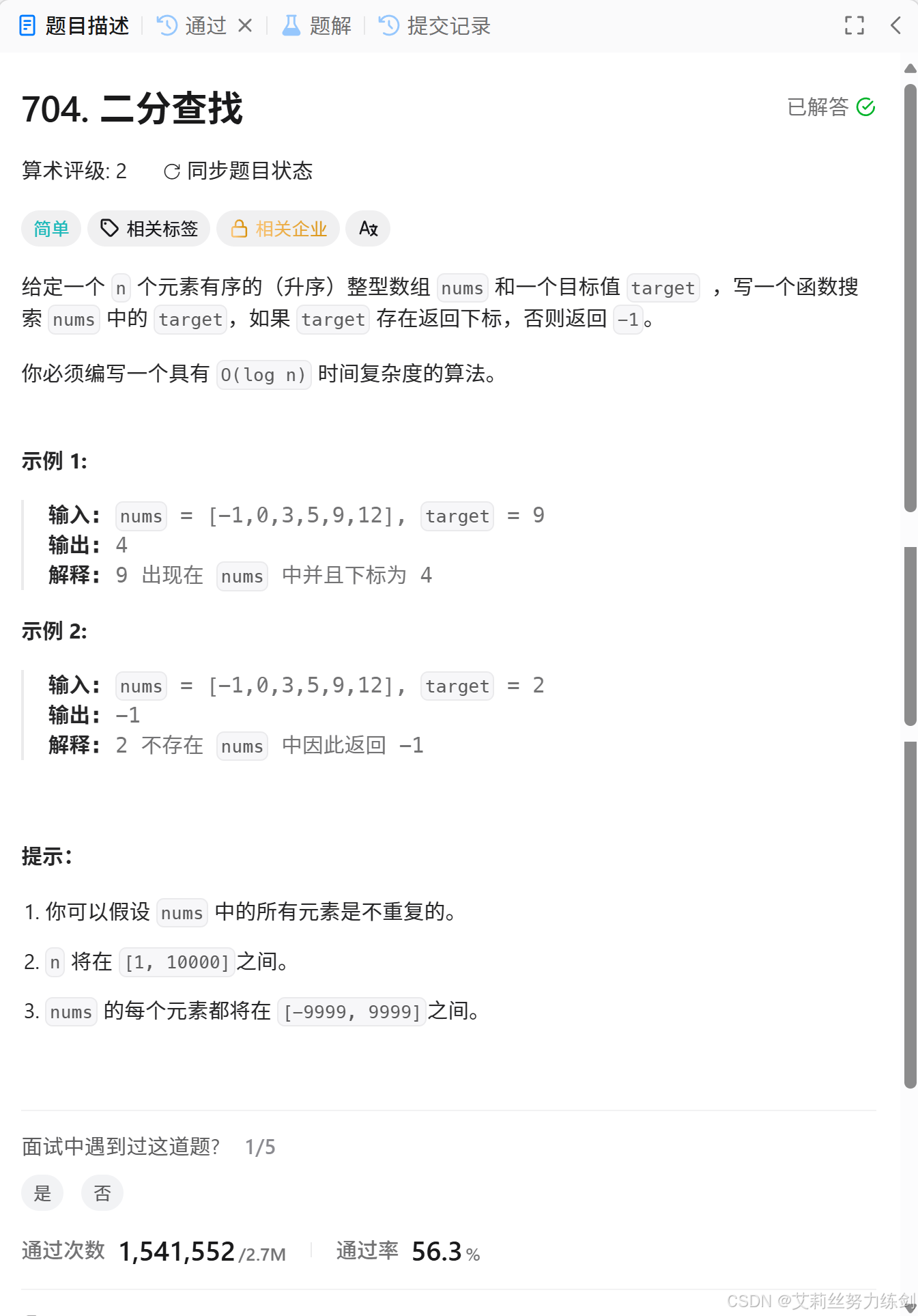 力扣题解链接:朴素二分查找模版解决【二分查找】问题
