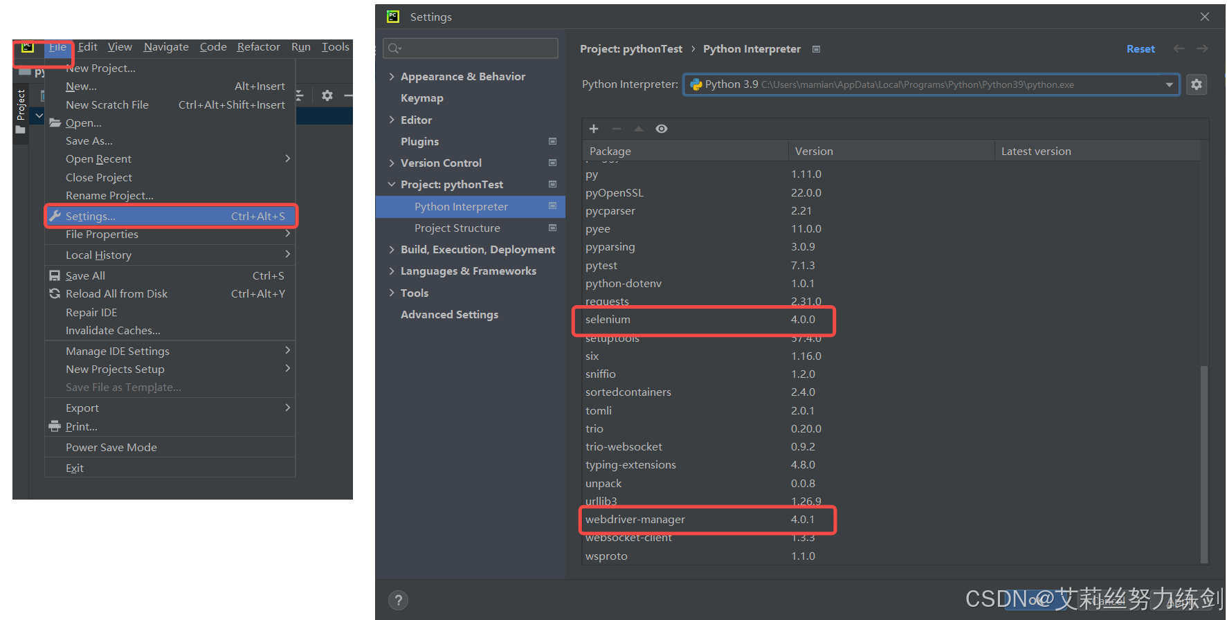 1) 检查python解释器,确定selenium库和WebDriverManager库都安装成功并加载到当前项目中:
