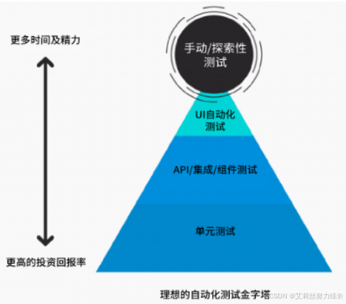 理想的自动化测试金字塔表达了自动化测试的理想情况,利用较少的时间和精力在单元测试上就能够发现更多有效的问题。