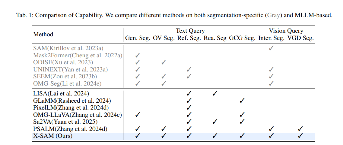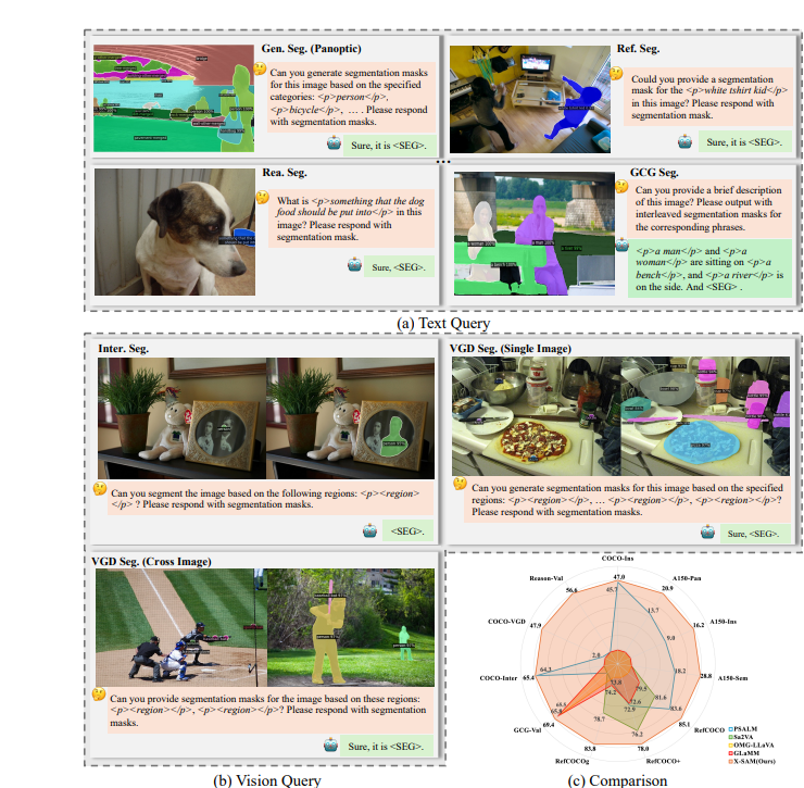 如图1和表1所示,我们展示了X-SAM的全面能力,并与其他方法进行了比较。我们提出的框架在处理基于文本查询的任务方面展现出能力,同时也能适应基于视觉查询的任务。此外,X-SAM利用LLMs的推理和生成能力,从而实现了先进的推理分割和接地对话生成分割。