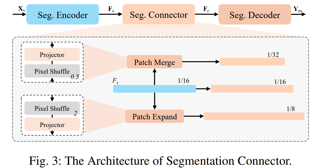 分割连接器。 对于图像分割任务,细粒度的多尺度特征对于分割解码器准确预测分割掩码至关重要。SAM中分割编码器的输出是单尺度的(1/16),空间分辨率较低。为了获得多尺度特征,我们设计了一个分割连接器 gcgc,以桥接分割编码器和解码器。如图所示,该连接器包含多个上采样和卷积层,用于从分割编码器输出的单尺度特征生成多尺度特征。