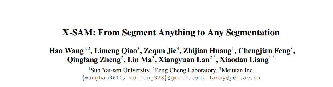 在这项工作中,我们提出了X-SAM,一个统一的分割MLLM,它将分割范式从"分割任何事物"扩展到"任何分割",将所有图像分割任务集成到一个单一模型中。我们的方法可以处理MLLMs中的各种多模态输入,包括文本和视觉查询。此外,为了使MLLMs具备视觉接地感知能力,我们引入了一个新的分割任务——视觉接地分割,进一步扩展了统一分割模型的能力。我们在所有图像分割任务上进行了广泛的实验,X-SAM使用单一模型在每个任务上都达到了最先进的性能。