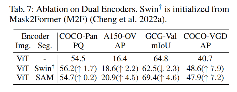 双编码器。 我们消融研究了X-SAM中双编码器的设计。如表7所示,带有SAM或Swin编码器的双编码器均有益于VGD分割,在COCO-VGD上分别达到了7.2% AP和7.9% AP。此外,带有SAM编码器的双编码器在GCG-Val和A150-OV上持续提升性能,而缺乏强大分割能力的Swin编码器仅在A150-OV上提供小幅改进,甚至对GCG-Val产生负面影响。