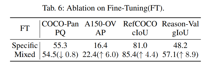 混合微调。 我们消融研究了混合微调对X-SAM性能的影响。如表6所示,混合微调提高了在域外COCO基准测试上的性能,证明了X-SAM强大的分割能力——例如,在A150-OV上AP提高了6.0%,在Reason-Val上gIoU提高了8.9%。然而,由于多源训练中平衡性能的挑战,它导致COCO-Pan上的PQ下降了0.8%。