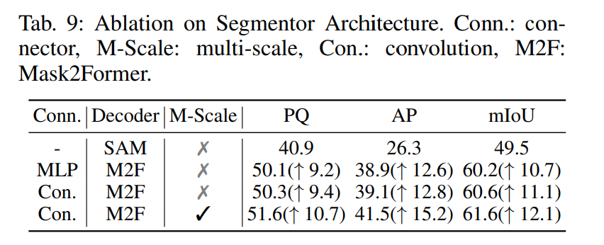 分割器架构。 我们通过进行12个周期的分割器微调来消融研究分割器架构的影响。如表9所示,M2F解码器带来了巨大的改进,提升了9.2% PQ,这归功于M2F的有效设计。卷积连接器的性能优于MLP连接器,因为卷积的空间感知能力有利于分割,而多尺度特征通过提供更多样化的尺度特征进一步提升了性能(10.7% PQ)。