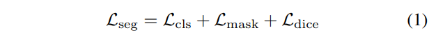 阶段1:分割器微调。 由于分割解码器被重新设计,我们需要训练分割器以适应在单次前向传播中分割所有对象。我们遵循的训练流程,在流行的COCO-Panoptic数据集上训练模型。为了在训练期间实现更快的收敛,我们解冻了分割器中的所有参数,同时以较低的学习率训练分割编码器。训练目标 LsegLseg 与中的相同,定义为分类损失 LclsLcls、掩码损失 LmaskLmask 和dice损失 LdiceLdice 之和: