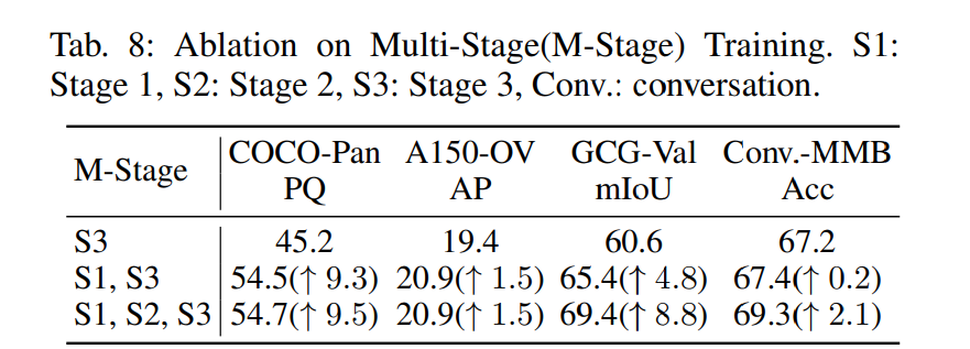 多阶段训练。 我们消融研究了多阶段训练策略的影响。如表8所示,S1分割器微调阶段提升了分割能力,在COCO-Pan和A150-OV数据集上分别带来了9.3% PQ和1.5% AP的显著提升。同时,S2对齐预训练阶段增强了图像理解能力,在Conv.-MMB上额外贡献了2.1%的准确率。通过整合这些阶段,X-SAM在图像分割和理解方面展现出强劲的进步,确立了其在处理复杂视觉任务方面的有效性。