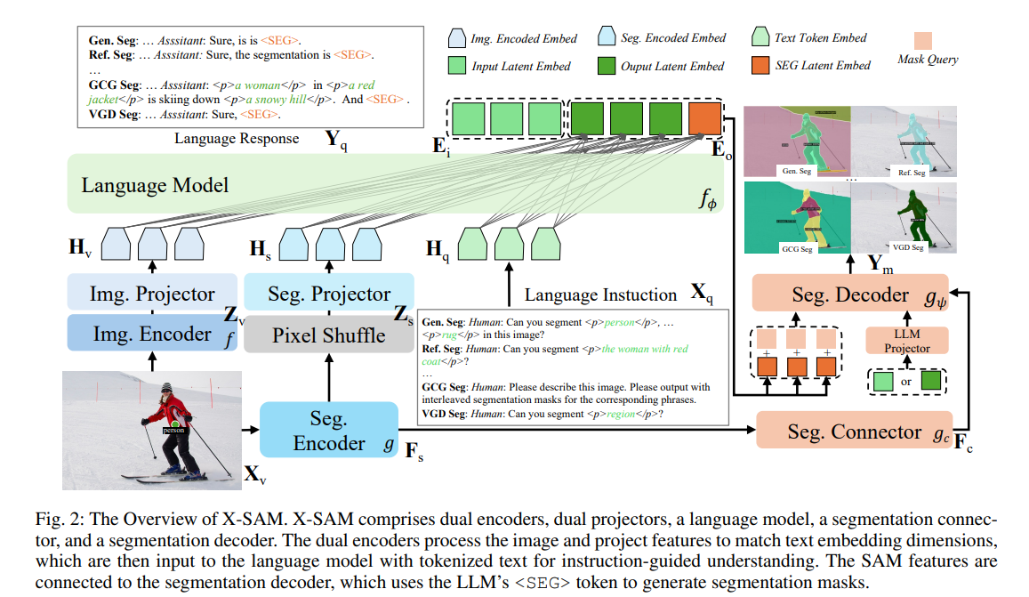 图2:X-SAM 概述。X-SAM 包含双编码器、双投影器、一个语言模型、一个分割连接器和一个分割解码器。双编码器处理图像并将特征投影到与文本嵌入维度匹配,然后与标记化文本一同输入语言模型,以实现指令引导的理解。SAM特征被连接到分割解码器,该解码器利用LLM的<SEG>标记来生成分割掩码。