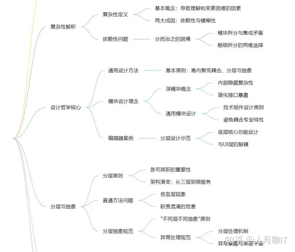 在概述复杂性之后,本书正式进入软件设计哲学的内容。书中探讨的核心内容主要围绕通用的软件设计方法和设计模式展开,其本质在于如何实现高内聚低耦合,以及如何进行有效的分层与抽象。尽管这些主题在软件工程领域并不陌生,但本书仍提出了一些关键观点。其中首要强调的是模块设计应追求深度而非浅显。