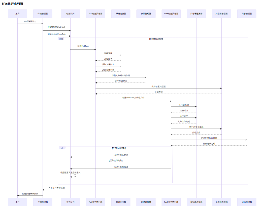 很好,我现在需要你接着mermaid mcp工具来帮我绘制两个UML图。一个是实现上面文件传输任务执行的核心类关系图。体现实现该功能用到的核心类和类之间的关系,一个是实现该传输任务功能的UML 序列图。然后在Mermaid绘图完成后,你需要单独生成两个独立的图片文件给我。