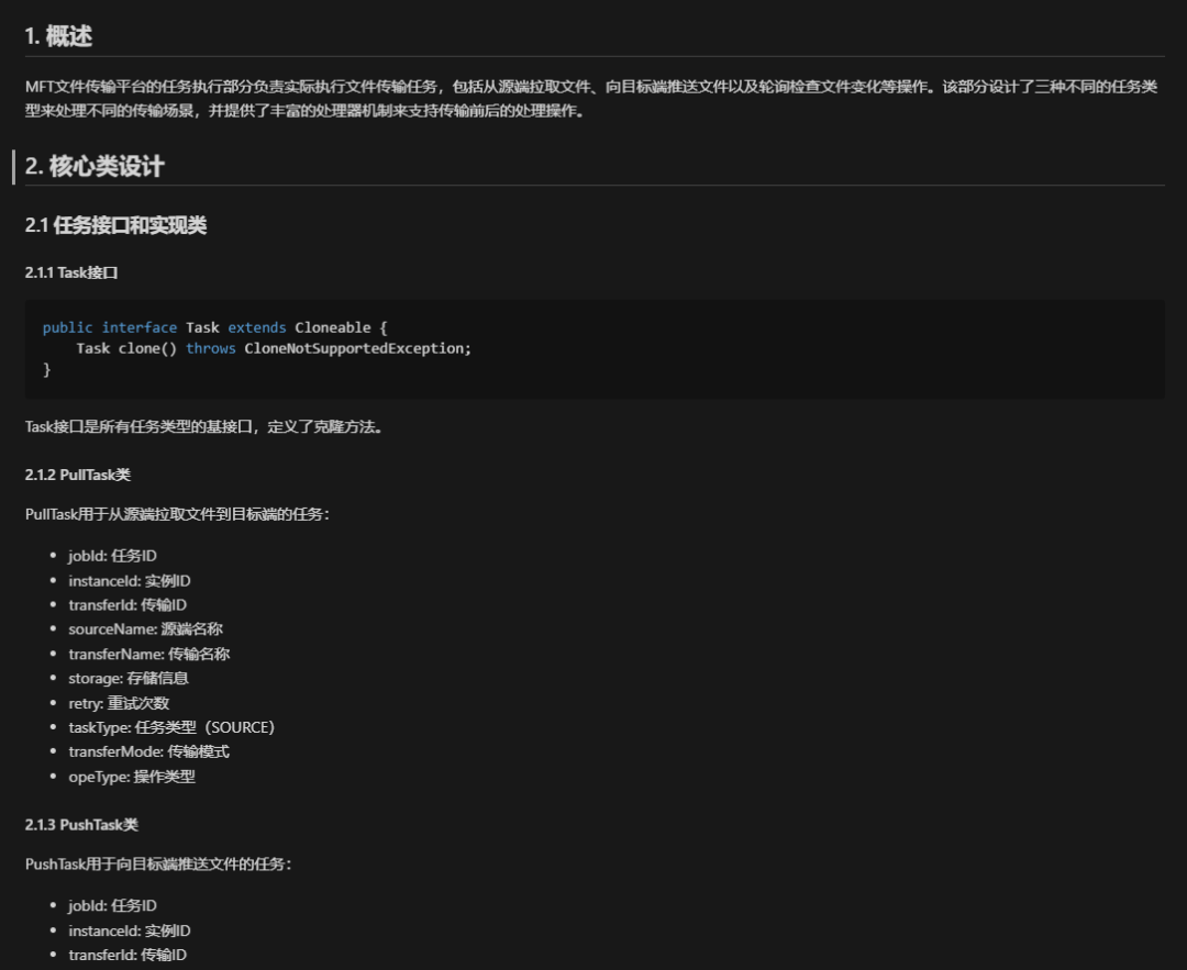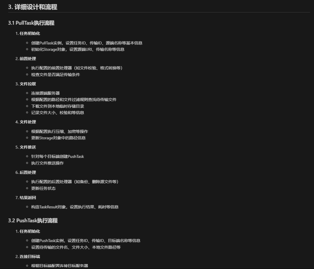 接着我们让AI帮我生成传输任务执行的详细说明书文档,我截图部分说明如下,可以看到里面有详细的类设计,任务执行算法流程设计等。