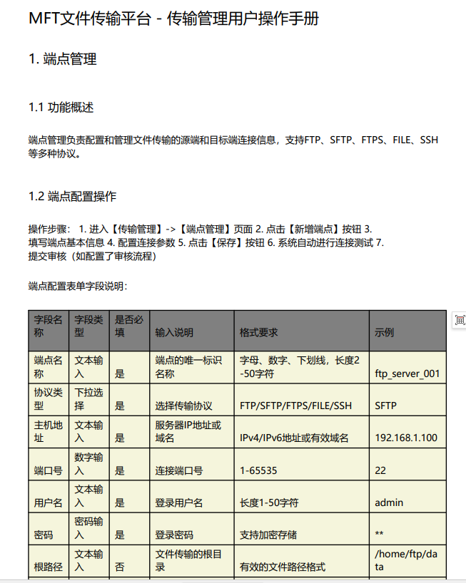 我们让AI帮我们输出传输管理中的端点管理和传输任务配置管理的操作手册或用户手册,具体内容需要包括功能说明,操作流程和操作步骤,详细的数据项填写规则和示例等。得到如下结果: