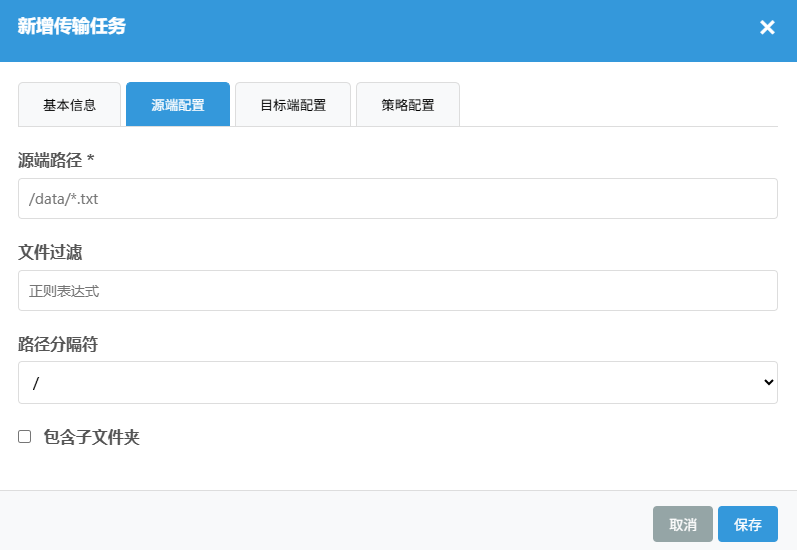 2.2 transfer_config 传输任务配置功能,注意点击新增传输任务按钮有跳窗录入界面,界面中还有多个tab页签分别录入不同的内容。