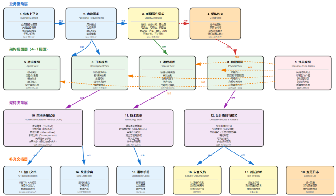 这张软件架构文档核心要素模型,基于经典的"4+1视图模型"和现代架构决策框架,系统地回答了三个核心问题:架构文档应该包含什么?这些要素之间是如何关联的?如何组织和编写这些文档?