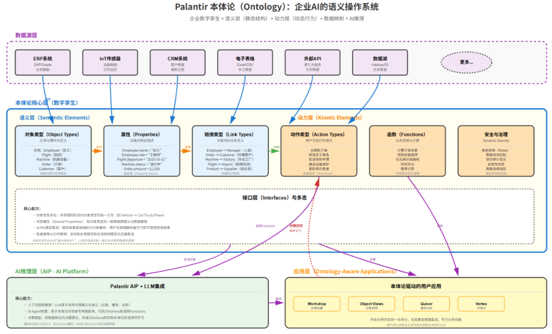 这不是哲学课上讨论的"存在的本质",而是Palantir用十多年时间打磨出的企业数字化核心引擎。它解决了困扰企业数字化转型的根本问题:如何让散落在各个系统中的数据真正"说同一种语言"?如何让AI不仅能处理数据,还能理解数据的含义?如何让人类的决策经验变成系统可以学习的知识?