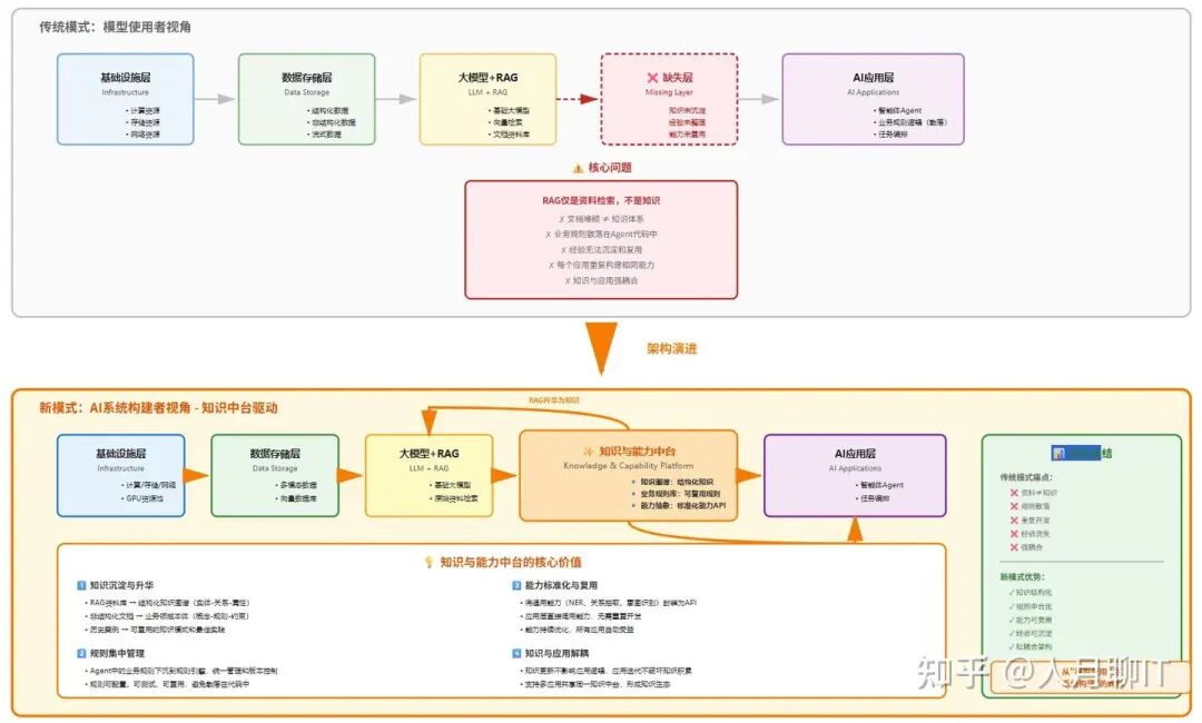 1. 传统模型使用者,我理解更多是 基础设施-》数据存储-》大模型+RAG库-》AI应用(智能体+编排+业务规则+逻辑)但是实际实际少了核心的知识和能力层的构建,这个构建是AI系统构建者的关键。 我核心思想是原有的RAG资料库如何上层到知识层,原有落在Agent里面的业务规则如何下沉到知识层,同时在结合类似知识图谱等让资料库真正升华为浓缩了知识经验的知识能力,基于这个知识能力再来构建上层的应用。我们现在缺的不是大模型和数据,资料;而是缺的知识的沉淀和整理。 因此新的模式如下: 2. 基础设施-》数据存储-》大模型+RAG-》知识和能力中台-》AI应用(智能体+编排+业务规则+逻辑)