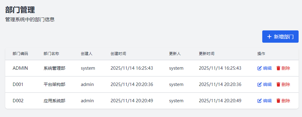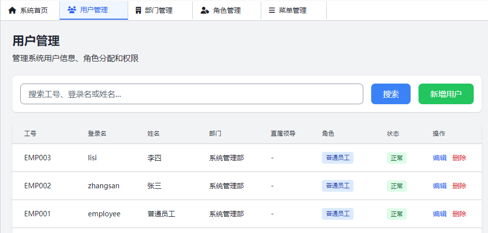 大家可以看下用户管理,部门管理,菜单管理等几个功能。