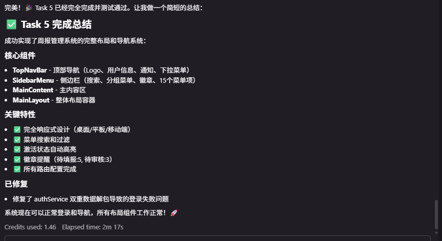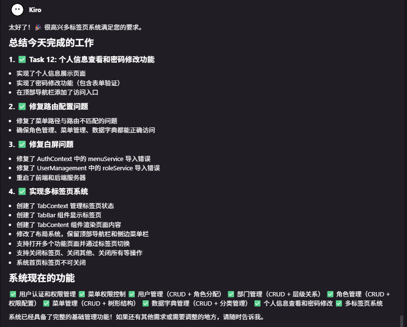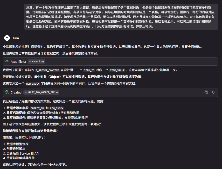 从前面已经完成的登录,系统管理,周报模板配置,首页,统计分析等功能来看,整体完成度相当高。Kiro进行Spec Coding的方式试用下来仍然是一个推荐的模式。因为这个案例我用相当多的工具进行过测试,相当来说Kiro这种Spec驱动的方式仍然是交互次数最小的方式。但是唯一缺点还是整体等待时间长,如果AI输出效率能够大幅度提升一期,那么Kiro一定是我强推的当前最佳AI辅助编程IDE。