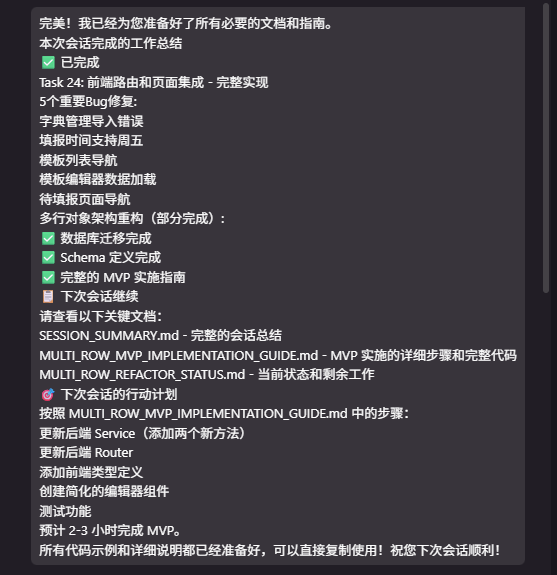 注意对于这个多行编辑,AI分析为一个大的变更或重构,会超过当前上下文会话的长度。因此AI会建议你开启一个新的会话进行处理,同时会将当前会话的关键内容和下一步的行动进进行总结,然后你直接拷贝后输入给新开的会话即可,这个地方整体实现思路也相当不错。