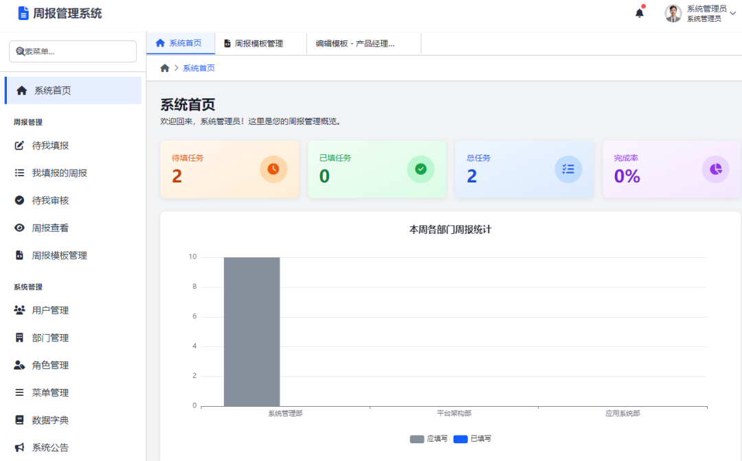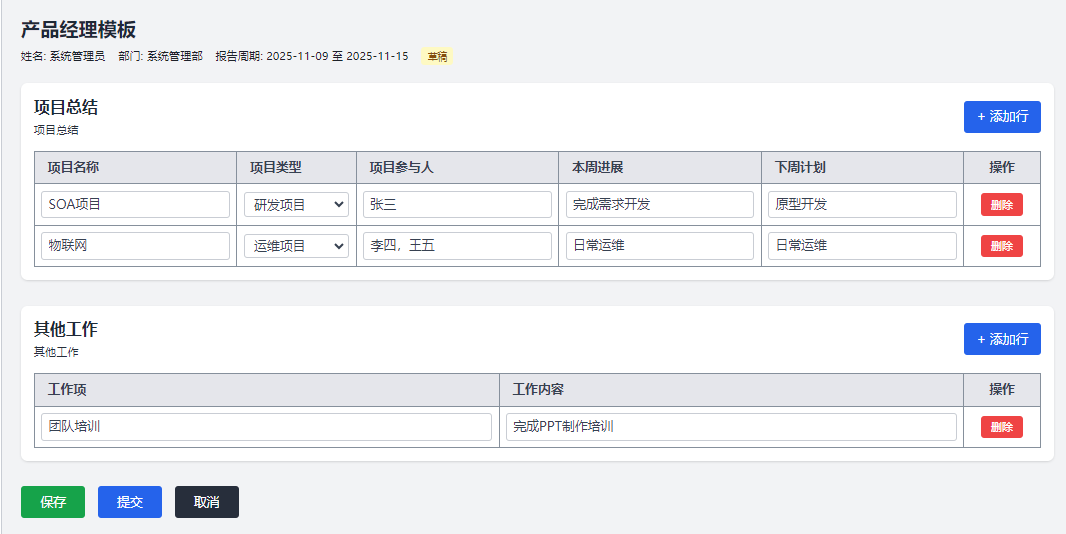 进入到某一个周报进行填报,类似我前面配置的产品经理周报,可以看到产品经理填报界面和我前面配置的周报模板界面完全一致。