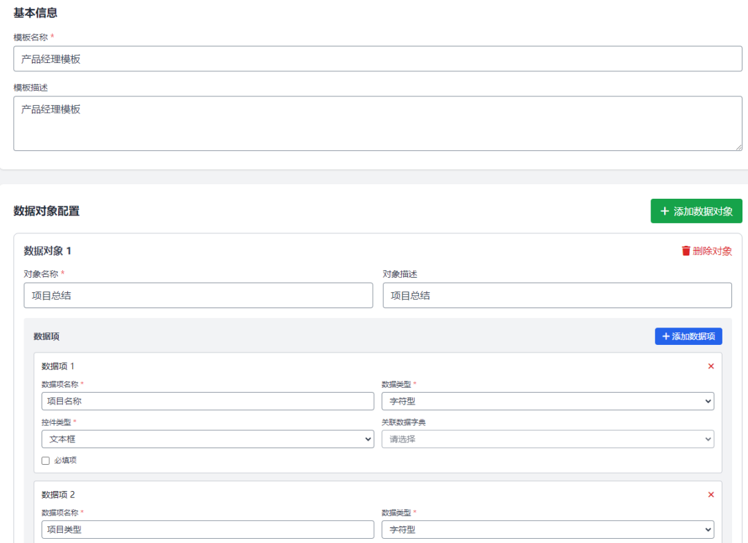 周报模板数据对象配置,这个功能实现完全符合要求,可以支持多个数据对象配置,同时每个数据对象还可以配置多个数据项。完全匹配我当初的需求内容。