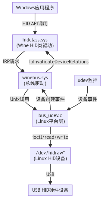 Wine通过一个多层架构将Windows的HID设备API调用转换到Linux的HID设备。整个流程涉及以下几个关键组件: