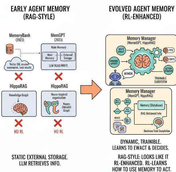 MemGPT (2023) | 外部 + 系统式内存 | 模拟操作系统的“主存储+外存”,LLM 主动在两者间读写 | ❌ 无 RL |