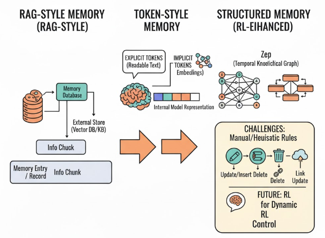 然而,管理这些复杂的结构化记忆依然存在挑战,尤其是在 记忆更新、插入、删除、抽象化以及链接更新 等方面。目前,这些操作主要依赖手工设计的规则或启发式方法,虽然有效,但缺乏灵活性和适应性。因此,未来的研究可以探索使用 强化学习 (RL) 来动态控制这些记忆模块的构建和调整。