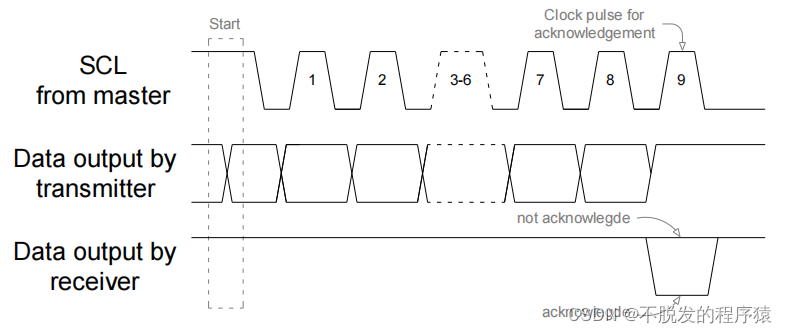当主机作为发送器件时,如果从机上产生无响应信号(NACK) ,主机可以产生停止信号来退出数据传输,或者产生重复起始信号开始新一轮的数据传输。当主机作为接收器件时,发生无响应信号(NACK) ,从机释放 SDA 线,使主机产生停止信号或重复起始信号。