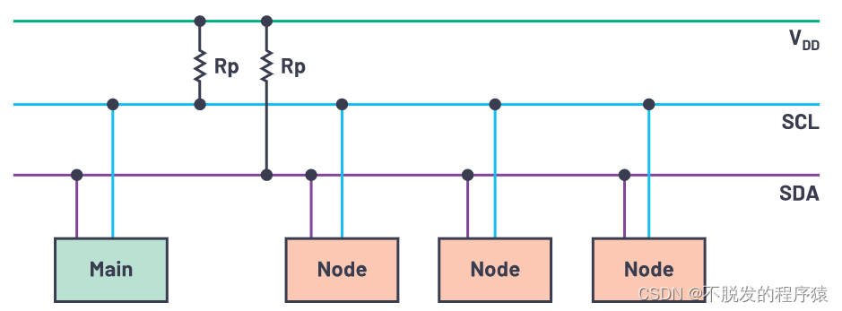 多主机模式:I2C总线允许多个主设备共享同一总线。在多主模式下,任何一个主设备都可以发起通信。