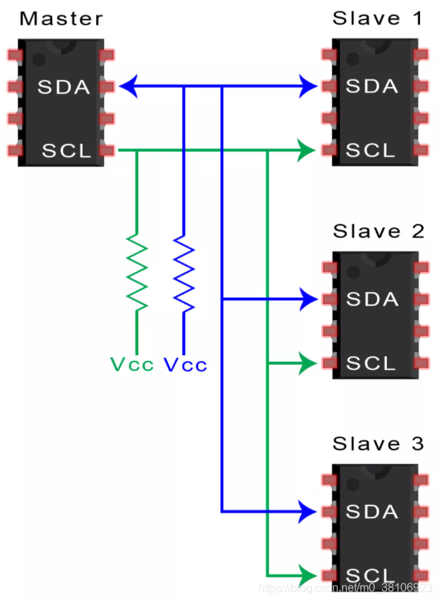 多从机模式:多个从设备可以通过唯一的地址进行区分,主设备根据地址选择需要通信的从设备。多个从设备不可以同时发送数据。