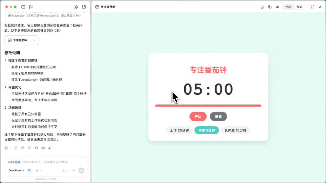 高度定制:觉得25分钟太长?没问题!直接在提示词里改成“默认20分钟”。不喜欢橙色?告诉AI“工作时间用蓝色系”。你可以像点菜一样,定制你的工具,这才是AI的真正魅力!