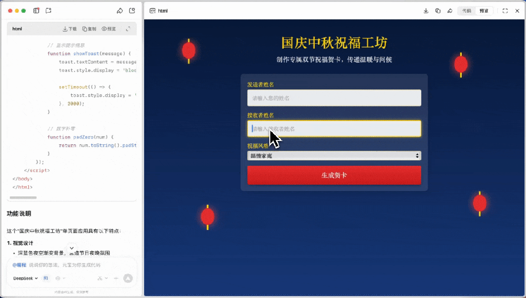 请帮我创建一个名为"国庆中秋祝福工坊"的单页面HTML应用。