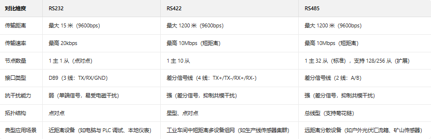 三大串口标准均基于串行通信原理,但在接口定义、电气特性、拓扑结构上差异显著,具体对比如下: