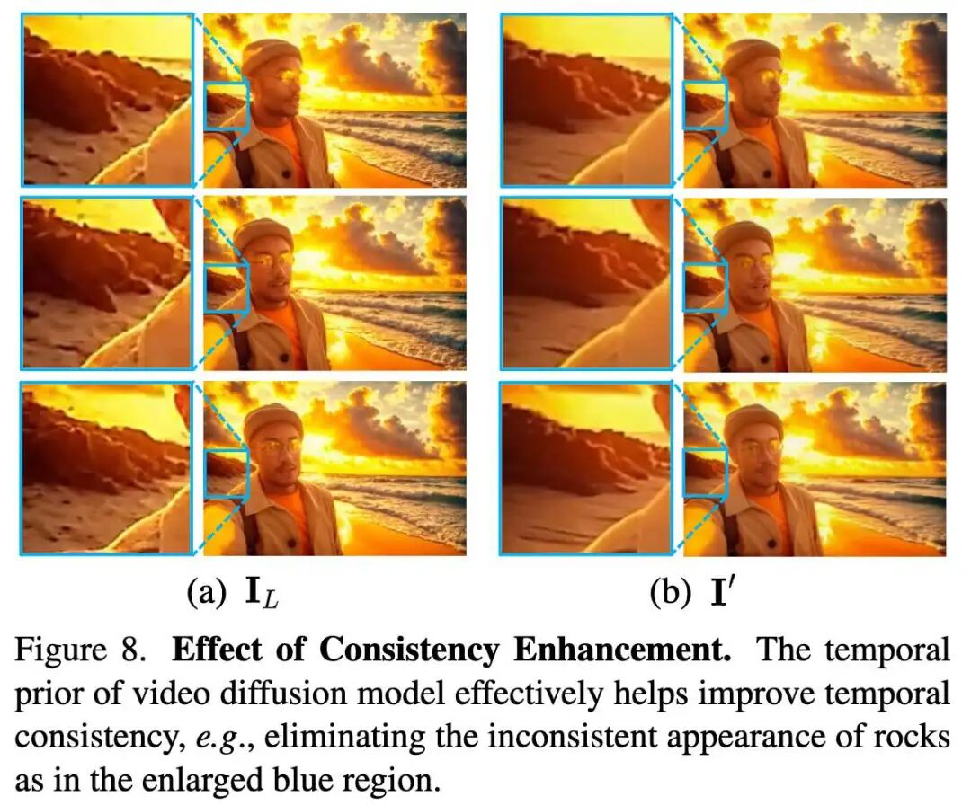 为了在 和 的光照效果之间取得平衡,同时利用来自 的时间一致视觉引导,本文提出了一个两步协调流程,如图2(b)所示。第一步,获得图像引导结果 。第二步,采用SDEdit的思想,通过使用 对其去噪来细化 的光照。具体来说,我们使用DDPM前向过程向 添加 步()的噪声,然后在 和 的条件下使用 对其去噪 步。如图4(c)所示,前景光照得到了很好的增强。然而,这种逐帧处理无法确保风格一致性(例如,海滩外观不一致以及两帧中棕榈叶位置的变化)。为了缓解这个问题,我们对 和 采用了跨帧注意力。将 的自注意力层替换为跨帧注意力层,其中所有帧从第一帧聚合键和值特征,而不是从它们自身聚合。结果,风格一致性得到加强,如图4(d)所示。请注意,我们的流程允许通过 来调整光照效果,即较大的 会产生具有强烈光暗效果的结果。