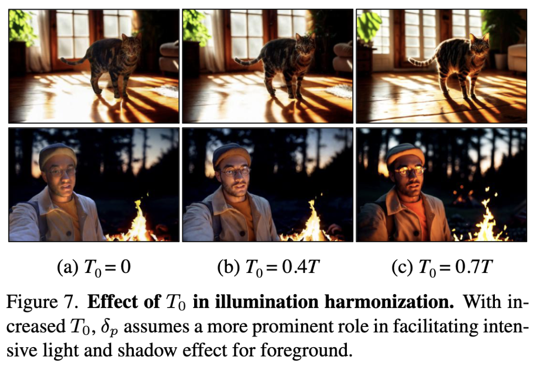 首先使用图像分割模型BiRefNet从 中提取前景物体 。现在,对于 的每一帧,我们有一个背景提示词 ,一个背景图像 和一个前景图像 。我们尝试了应用图像引导和文本引导的IC-Light来组合它们。然而,两者都没有产生合理的结果。如下图4(a)(b)所示,图像引导的结果 光照协调不足(缺少背光效果),而文本引导的结果 具有强烈的光照效果,但由于缺乏图像引导,存在时间不一致和背景相机运动不匹配的问题。