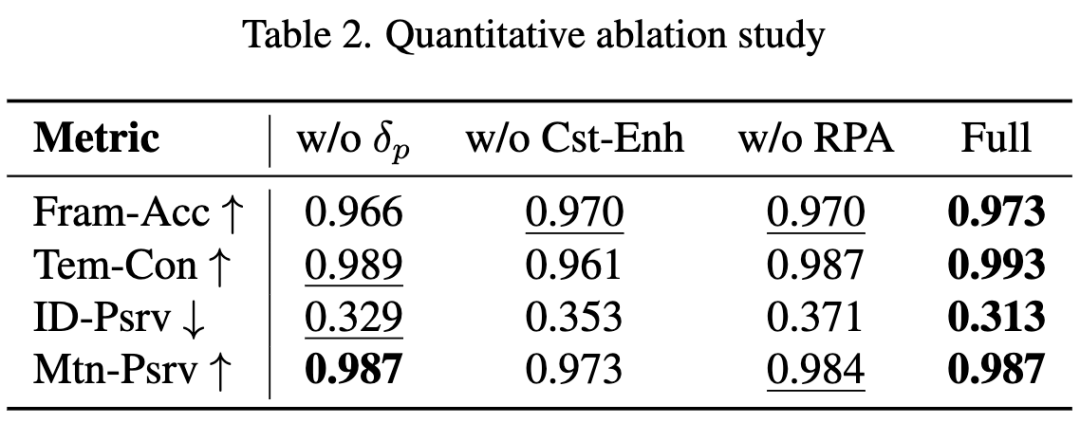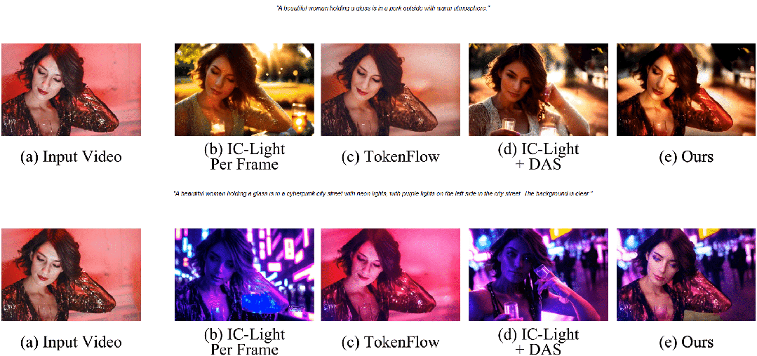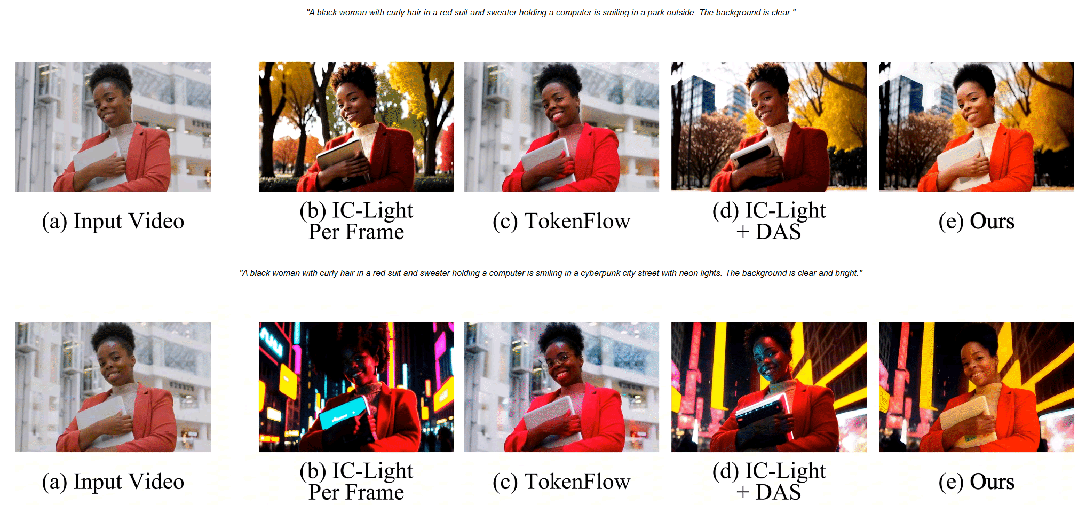 下图6对所提方法与其他基线方法进行了可视化比较。IC-Light本质上是一种图像扩散模型,因此天生存在时间不一致性问题。此外,它倾向于对主体进行过度重新打光,甚至改变固有属性(如衣服和头巾的颜色)。TokenFlow表现出有限的编辑能力和不足的前景细节控制能力,而 DAS则无法保持对前景运动动态和固有外观属性的控制。相比之下,本文的方法在实现高质量背景替换和前景重新打光的同时,确保了时间一致性和前景细节一致性。