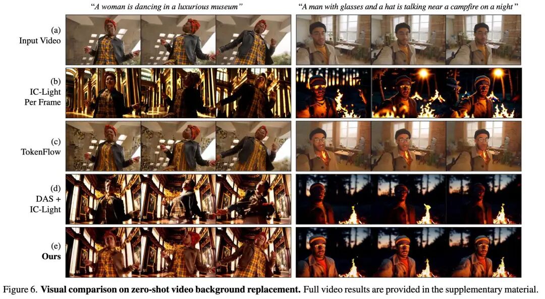 与Light-A-Video的比较。在下图10中进一步提供了与同期工作Light-A-Video的视觉对比。两种方法均基于CogVideoX,生成质量相当。然而,Light-A-Video的CogVideoX实现仅能对现有背景进行重新打光,而本文的方法能生成新的背景内容。